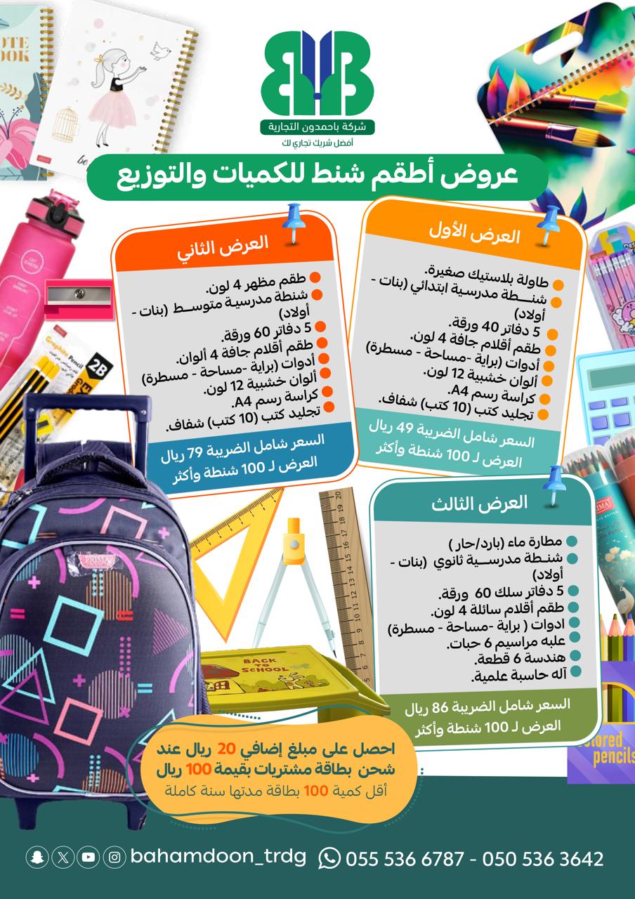 نُعلن عن مبادرة بيع حقائب مدرسية متكاملة للطلاب بأسعار مميزة ، تتضمن أهم الأدوات المدرسية الأساسية، كما هو موضح في الجدول المرفق.